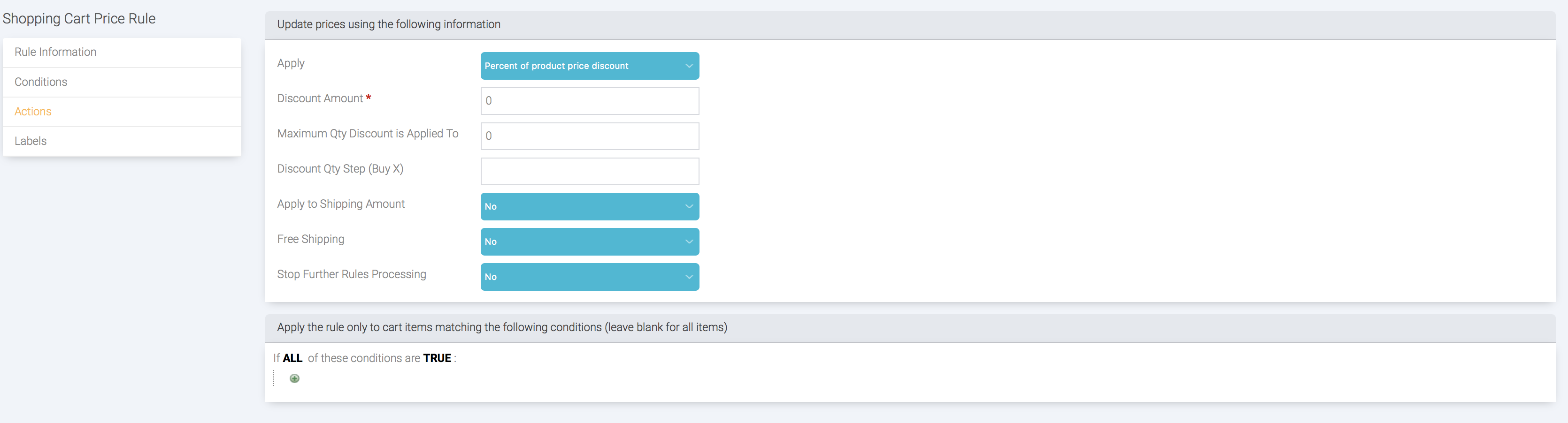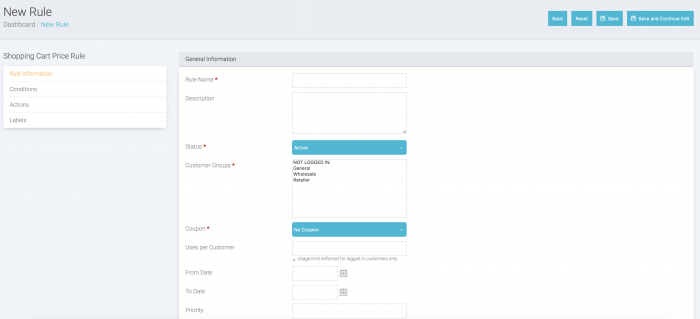 1. În meniul Admin, selectați Promoții> Regulile prețului cartului de cumpărături. Apoi, faceți clic pe butonul Adăugați o nouă regulă.