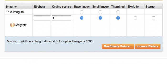 Poza principala care este si prima poza a produsului trebuie sa ii selectati toate bifele: base image, small image, thumbnail pentru a aparea in magazin.
